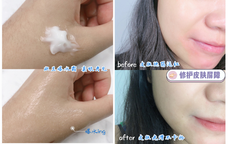 抹開就有滿滿的小水珠,質地介於乳霜和啫喱之間,清爽保濕不油膩,一年四季都可以用。